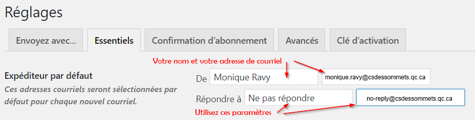 Le premier paramétrage à faire se trouve dans « Réglages/essentiels » du menu MailPoet.