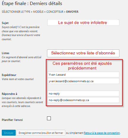Note: Lorsque vous cliquez sur Envoyer, le système procède à un envoi par lot afin de ne pas embourber le serveur de courriels de la CS. Habituellement, en quelques heures, toutes es infolettres ont été livrées.