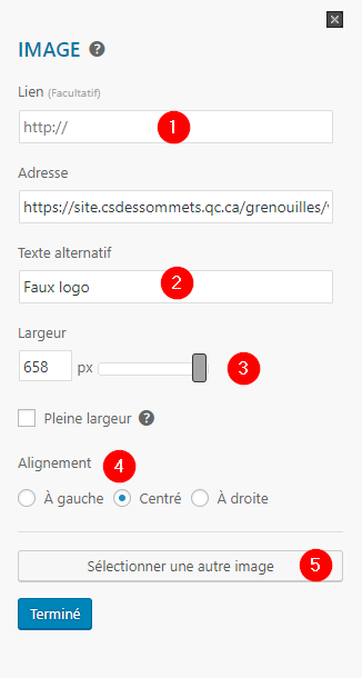 Lorsque vous ajoutez une image et que vous cliquez sur « Modifier les réglages », vous pouvez Mettre un lien sur l’image (1), ajouter un texte alternatif (texte qui apparaît au survole de l’image)(2), modifier la dimension de l’image(3), décider de l’alignement(4) ou sélectionner une autre image(5).