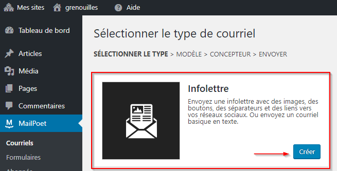 L’étape 3 consiste à créer votre infolettre. Cliquez sur Courriels, sur Créer et sélectionnez Créer dans la zone Infolettre.