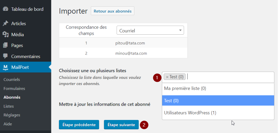 e. Vous pouvez ajouter plusieurs adresses du même coup. Pour ce faire, cliquer sur « Importer » et cocher « Coller les données dans une boîte de texte ». Cliquez ensuite sur « Étape suivante » et sélectionnez dans quelle liste vous voulez ajouter les membres (1). Cliquez une autre fois sur Étape suivante (2).