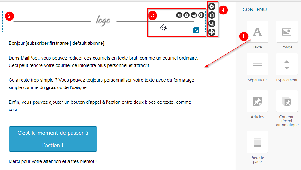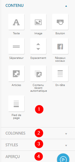 Dans la colonne de droite, en plus des différents modules d’édition(1), vous retrouverez la possibilité d’ajouter des colonnes à votre infolettre(2), de modifier les styles(3) de votre infolettre (dimension et couleurs des textes, fond, etc.) ainsi que la possibilité de voir un aperçu de ce qu’aura l’air votre infolettre dans un navigateur ou dans un courriel(4).