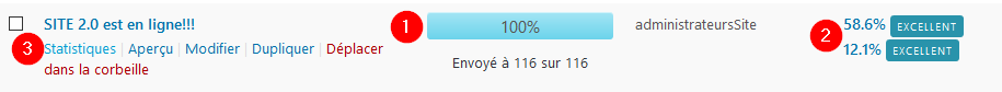 Sur cette image, on peut voir que toutes les infolettres ont été livrées(1), que la consultation est à un bon niveau(2). Pour avoir toutes les statistiques reliées à votre infolettre (qui a consulté, etc.), cliquez sur Statistiques.