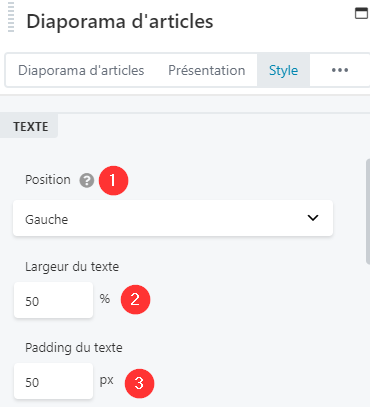 Le texte peut se positionner à gauche, au centre ou à droite. Vous pouvez aussi modifier le pourcentage de sa largeur et finalement modifier le padding du texte (indentation).