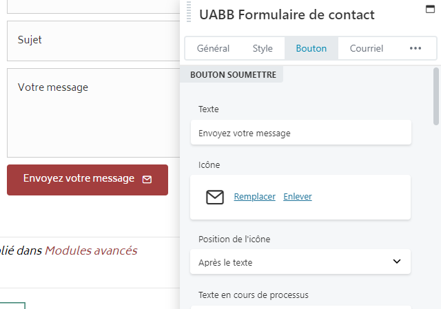 Ensuite, pour le bouton d’envoi du message, vous ajuster les paramètres dans l’onglet «Bouton», notez bien que, par défaut, les textes qui s’affiche sur le bouton d’envoi avant et pendant le processus d’envoi sont en anglais, on doit donc les changer. Des options d’apparence du bouton sont aussi possibles (icône, couleur,etc.).