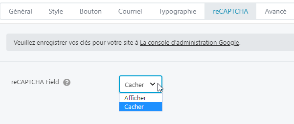 Finalement, afin de pousser l’utilisateur à prouver qu’il n’est pas un robot, vous avez l’option d’appliquer un reCAPTCHA dans l’onglet du même nom.